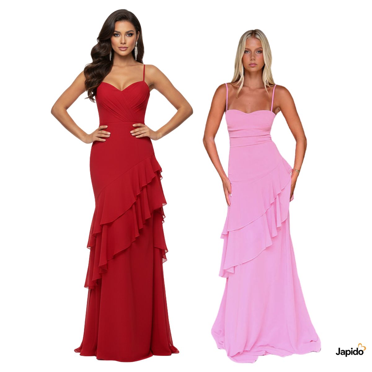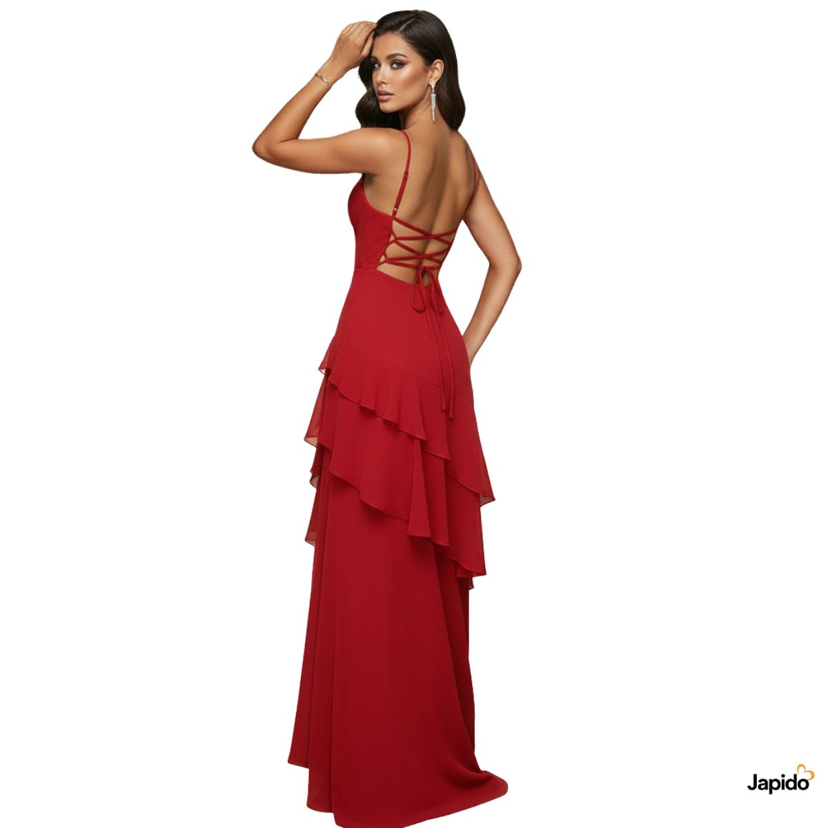 Cada detalle, desde sus elegantes Olanes en Cascada que añaden movimiento y gracia, hasta su sofisticada Espalda de Corsé que moldea tu silueta a la perfección, ha sido pensado para transformar cada evento en tu momento de brillar.